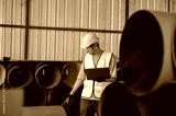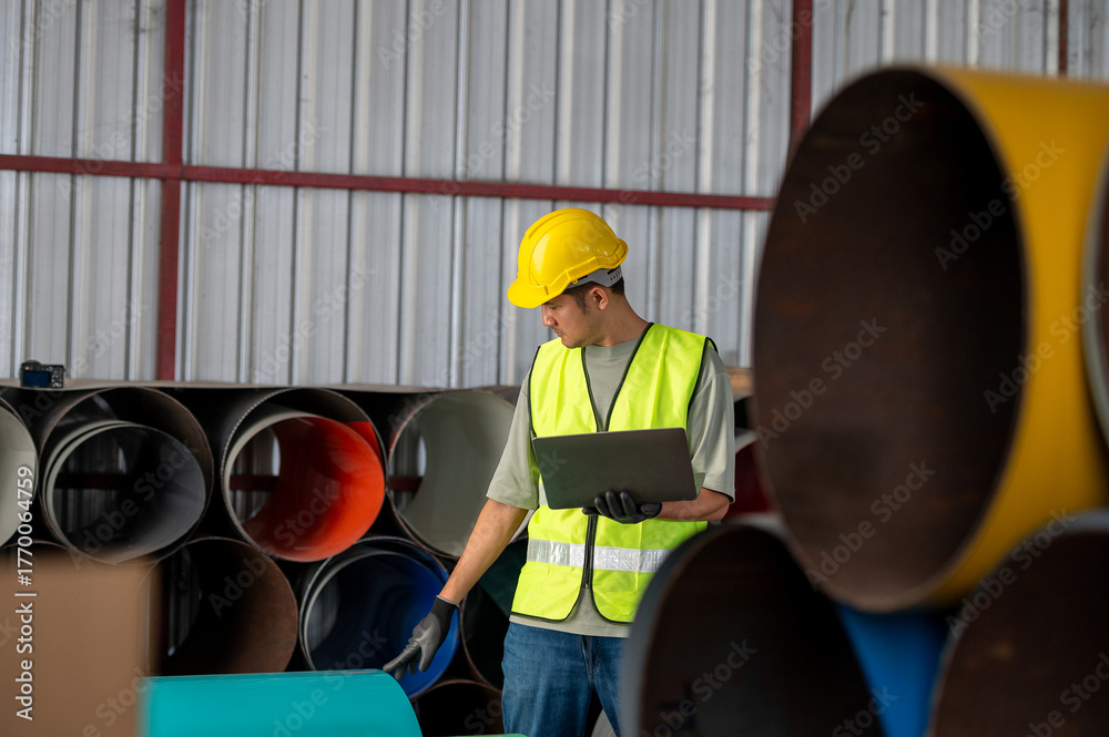 Construction Worker in Safety Vest and Hard Hat Inspecting Colorful Materials in Warehouse Environment