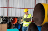 Worker Using Digital Tablet in Industrial Warehouse Surrounded by Colorful Metal Drums and Containers