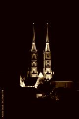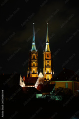 Gothic cathedral with twin illuminated towers at night against dark sky, view from riverbank. Concept of architecture, religion and European travel