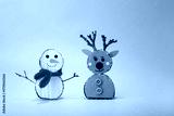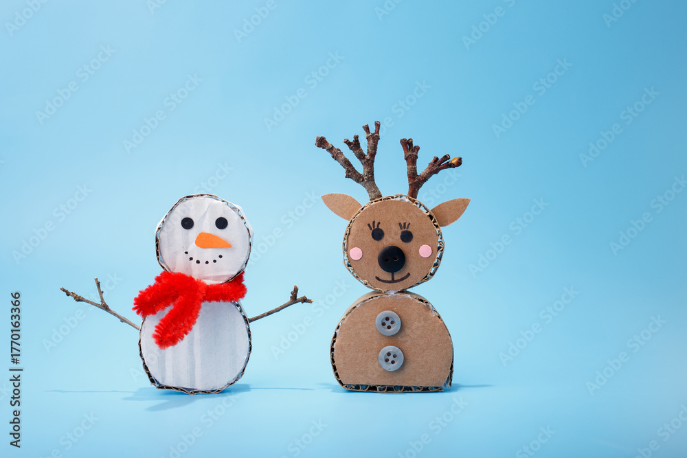 Snowman and reindeer made of cardboard and twig details on blue background. Studio craft composition with copy space. DIY winter holiday and Christmas concept for design, greeting card, and poster