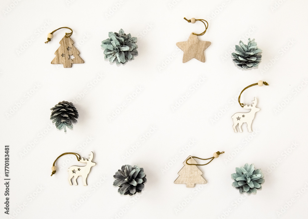 Wooden toys for Christmas tree and cones . New Year's background..Copy space