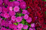Chrysanthemum garden background. Top view of the floral background of pink, red chrysanthemums. Full frame. A layout for the design. The concept of autumn, Mother's Day. Colorful Floral greeting Card