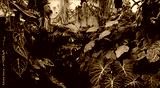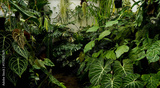 scenery of tropical plants, indoor garden, huge green leaves, including monstera philodendron anthurium and alocasia plants