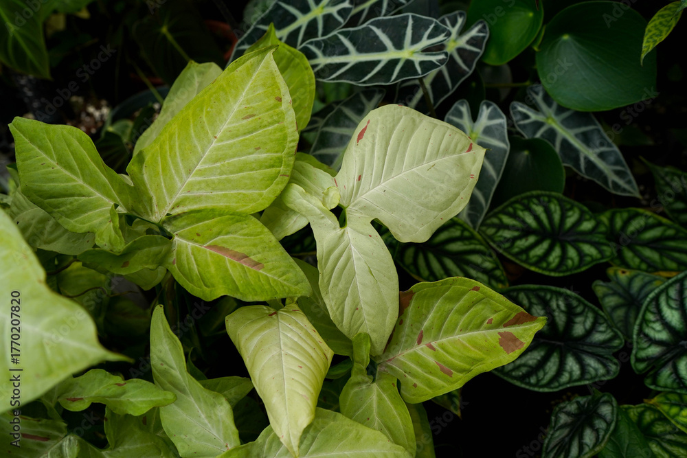 scenery of tropical plants, indoor garden, huge green leaves, including syngonium and alocasia plants