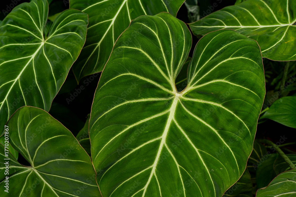 close up of Philodendron gloriosum leaves, dark leaves indoor plants, tropical garden, heart leave philodendron