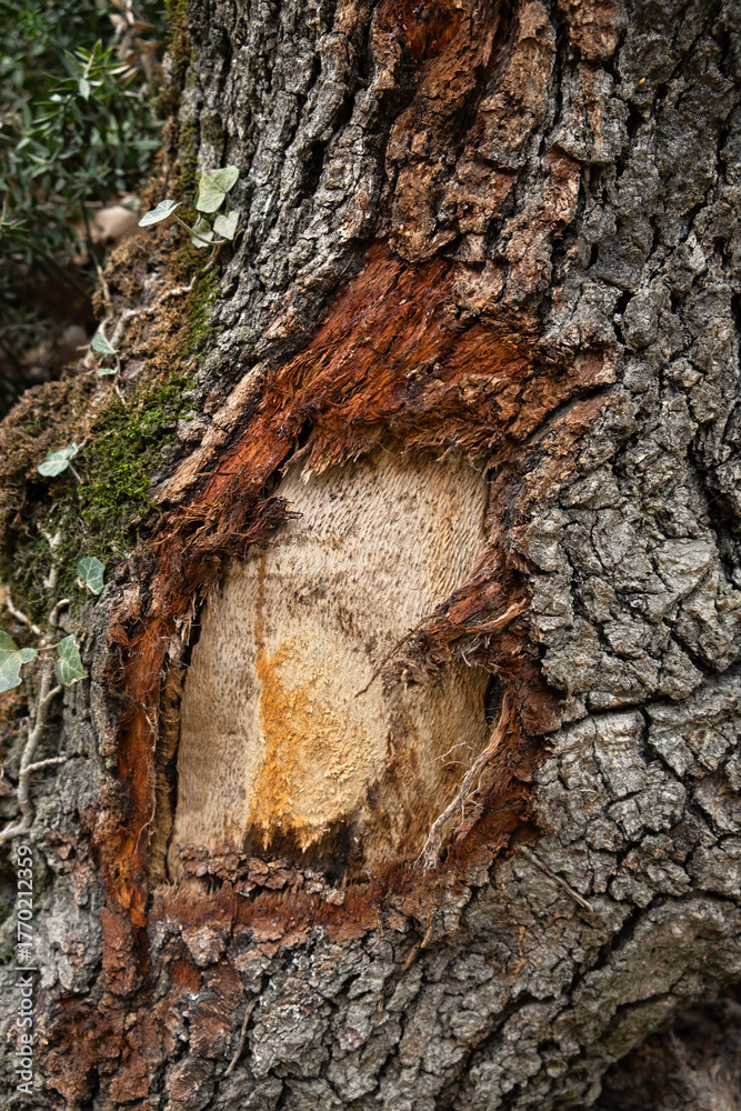 Oak bark texture. Macrophotography of tree bark. Abstract background for design, presentations and creativity. Brown and green are natural shades. Full frame. Bright sunlight on the veins, moss inside