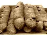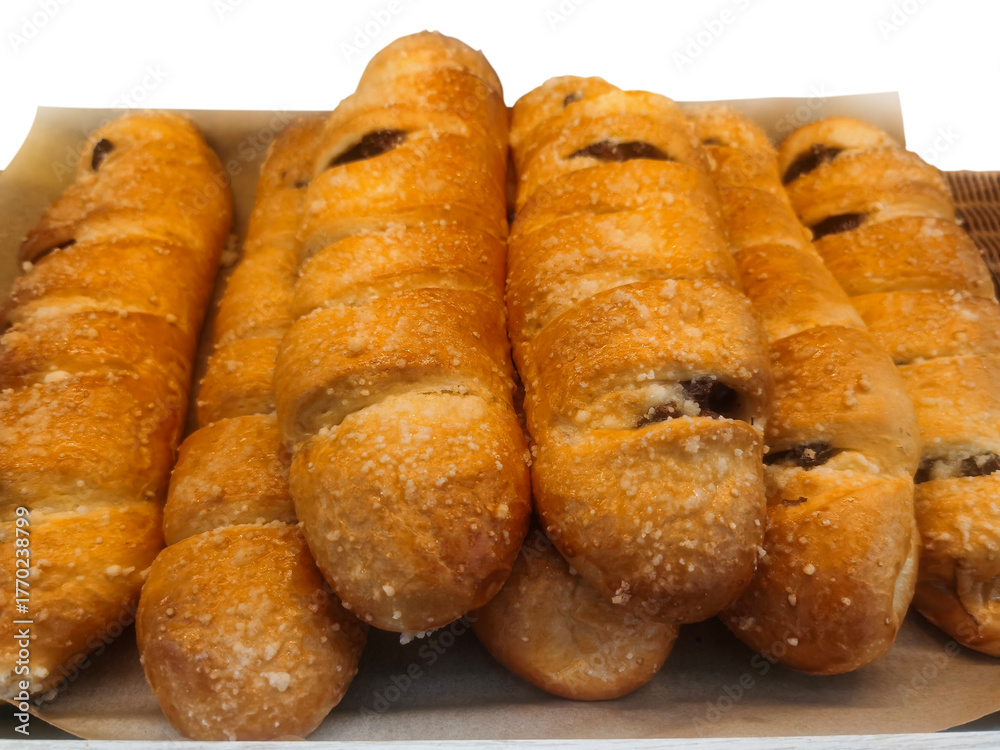 Freshly baked long bread placed on paper, isolated on white background.