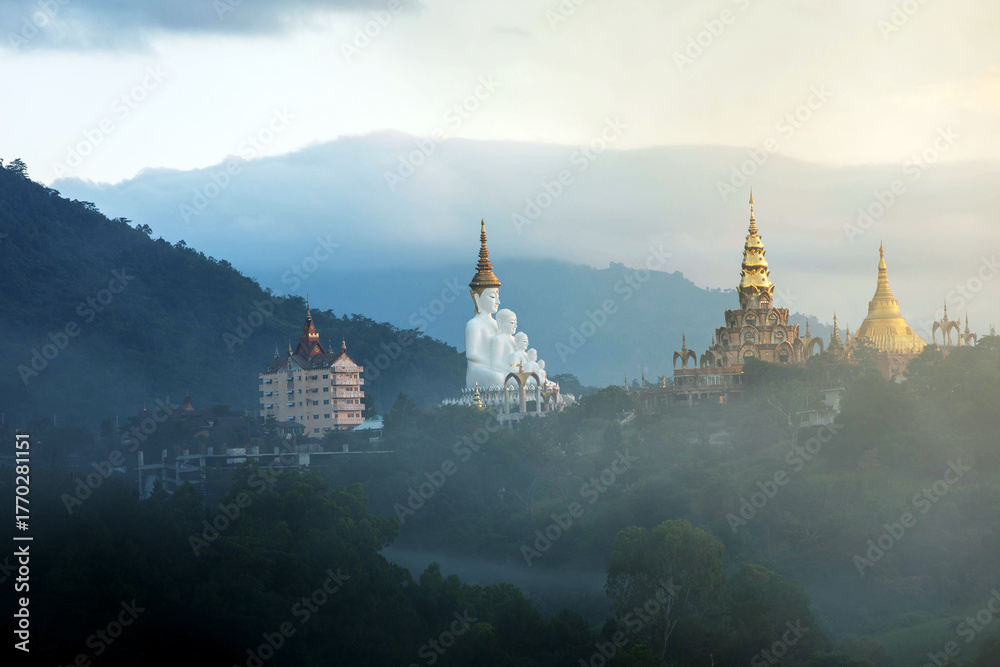 The stunning scenery of Wat Phra That Pha Sorn Kaew in Thailand showcases five serene Buddha statues and a golden pagoda surrounded by lush green hills, morning mist, and a glowing sunrise sky.