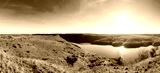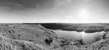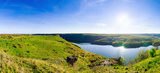 A stunning high-angle panoramic landscape of a wide river canyon near Subich. A lush green, grassy hill slopes down to the calm water, with a dense forest on the opposite bank under a clear blue sky.