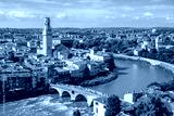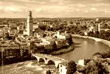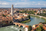 Aerial panorama of Verona, Italy, featuring the Duomo di Verona and the ancient Ponte Pietra bridge crossing the Adige River, surrounded by red-tiled roofs and the historic heart of the Veneto region