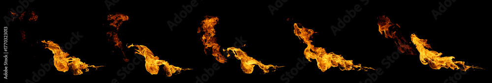 Set fire flame isolated black background. motion design, burst effect, cinematic explosion scenes, heat energy concepts in torch. heat texture, burn in the grill. flame blaze at night, fire sizzling