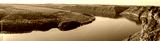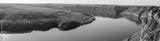 A breathtaking panoramic view of the Dniester River canyon near Subich, Ukraine. Mossy rocks are in the foreground, overlooking the calm blue water and green forested hills under a bright sun.