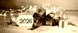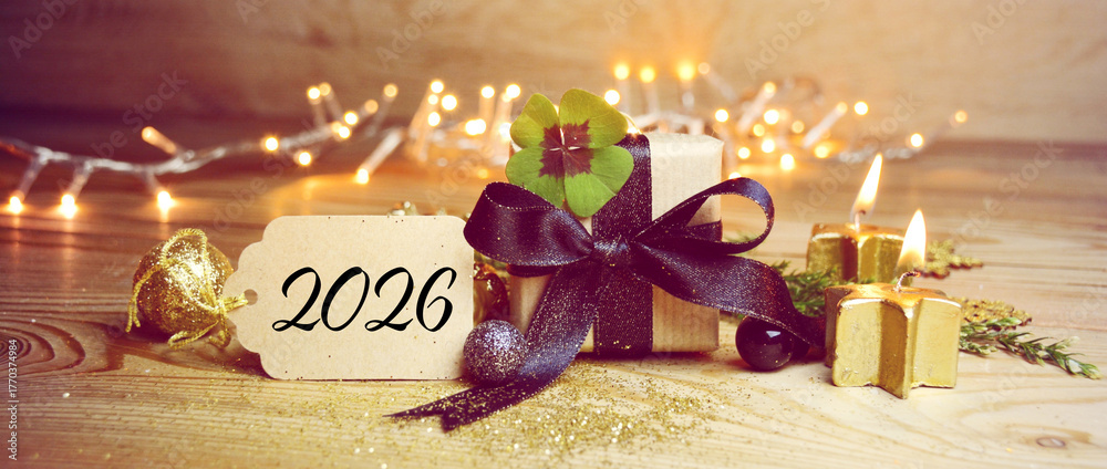 New Year 2026 background banner with copy space - Lucky clover leaves with magical bokeh lights and gift box - clover, shamrock, good luck
