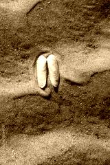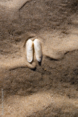 “False angel's wing“, “false angel's tail” or “American piddock” (Petricolaria pholadiformis) is a saltwater mussel from the Veneridae family, the clams. Close up of symmetrical shells on sandy beach.