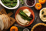 Thanksgiving plate with turkey, mashed potatoes and green beans