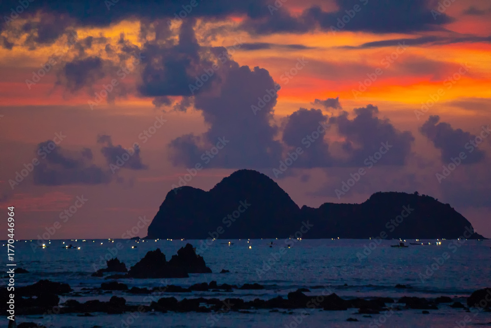 Dramatic twilight with a large island profile, colorful clouds, and sea with boat lights.