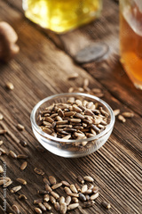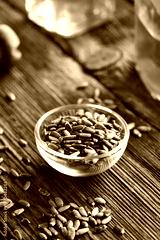 Milk thistle seeds in a bowl on a wooden table
