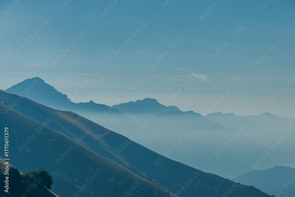 Scenic view of the mountains surrounding Como lake from Monte di Tremezzo on a sunny summer day