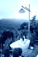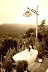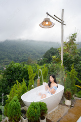Beautiful Asian woman relaxing in outdoor bubble bath with mountain view and mist, enjoying warm water and natural atmosphere at Thailand wellness resort.