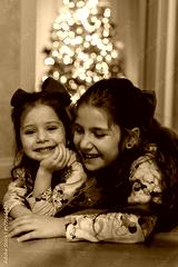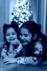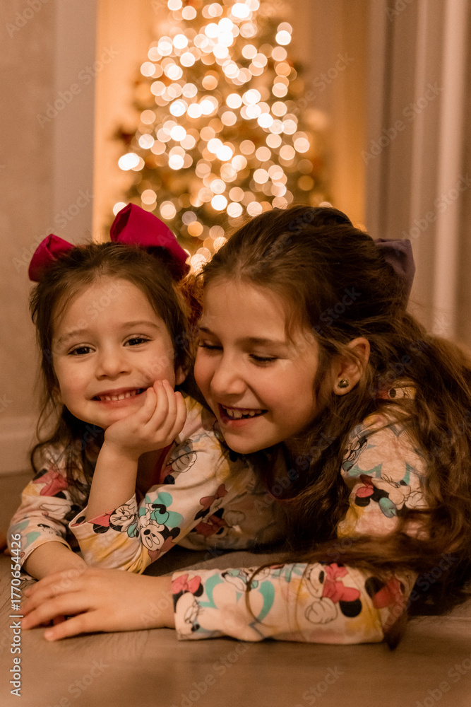 two little girls in pajamas by the Christmas tree at home on Christmas night