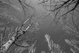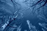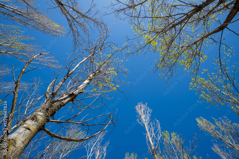 Branches of tall trees stretch upward against clear, bright blue sky. Fresh green leaves begin to bud, signaling arrival of spring. scene reflects peace and tranquility in nature