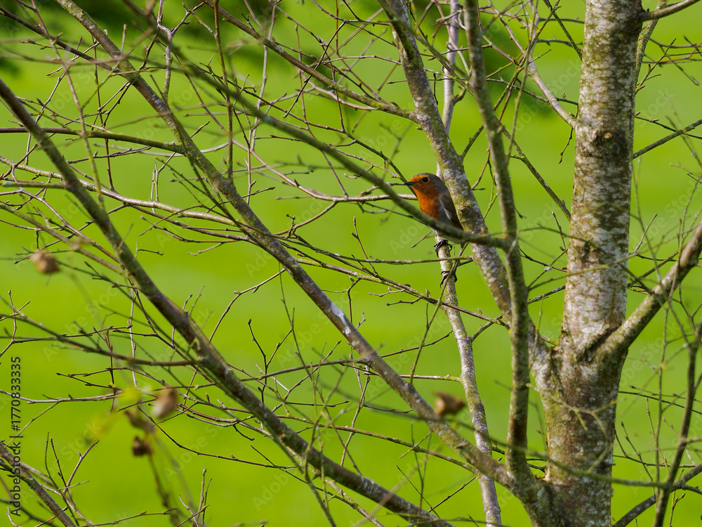 A small European robin sits on a tree branch. The background shows a bright green field, likely located in the West Cork region of Ireland.