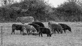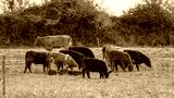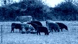 A herd of cattle, including calves, are grazing in a bright green field. Some are drinking from blue troughs. The background is a hedge row and green field in West Cork.