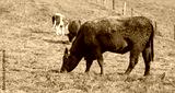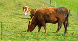 Several brown cows are grazing in a vibrant green field during the daytime. A wooden fence is visible in the background of the Irish countryside.