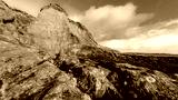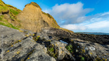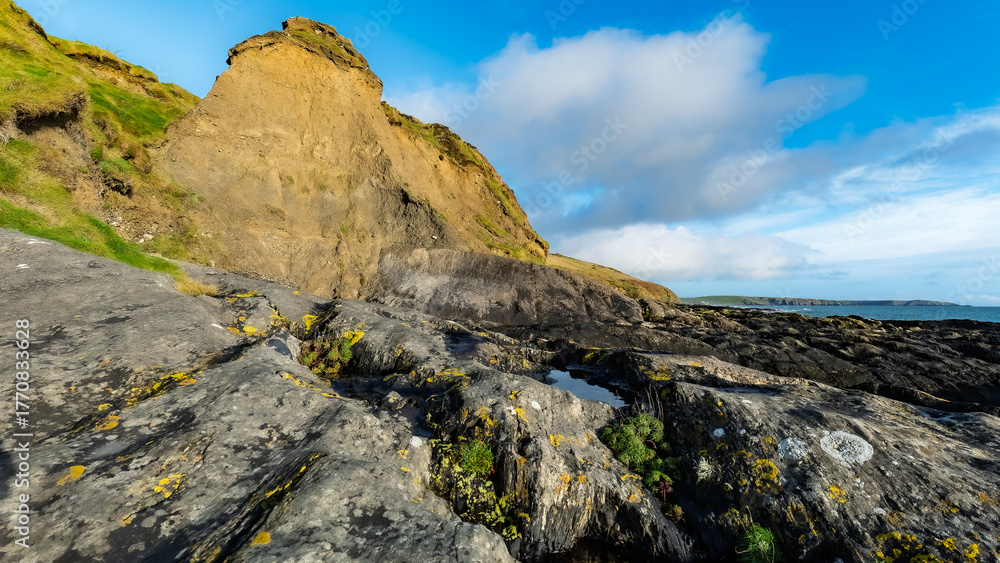 A rocky coastline features layered rock formations and green grass. A pool of water sits on the rocks, with the Atlantic Ocean and sky visible in the distance in West Cork.