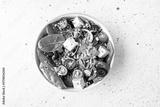 Fresh vegan salad with baby spinack leaves, tofu, cherry tomatoes, onion and seeds in ceramic bowl on white stone table top view. Healthy diet food concept.