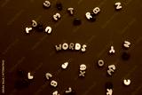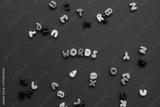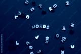 Minimalist flat lay with colorful alphabet letters forming the word “WORDS” on a brown background. Creative concept for language, communication, or education themes