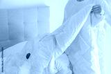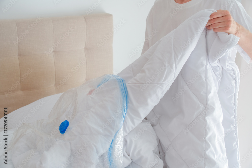 Woman hands putting duvets and pillows into a plastic vacuum sealed bag. Seasonal bedding storage, smart home organization