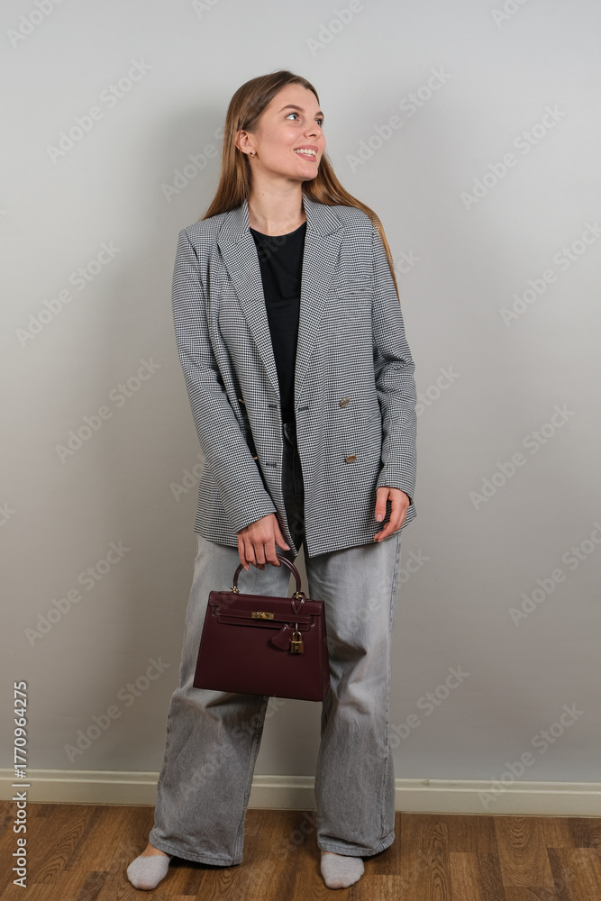 A sophisticated woman in a gray checkered blazer poses with a designer-inspired Burgundy handbag. Suited for branding, accessories promotion, or social media campaigns on women's fashion.