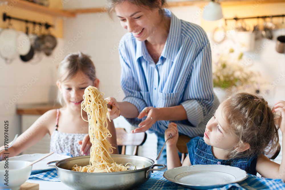 Happy family eating pasta at home kitchen. Mother and children have fun together, enjoying lunch, healthy comfort food for kids. Cooking homemade Italian cuisine. Candid, authentic lifestyle