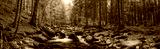 Panorama view of the mountain river in the middle of the colorful autumn beech and spruce forest