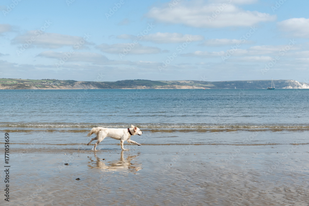 Golden retriever running on the beach on sunny day