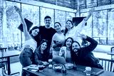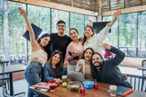 selfie portrait of Latino university students gathered together studying in cafeteria using laptop and notebook at breakfast time. young hispanic people woman and men in Mexico Latin America