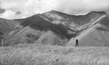 Lone hiker standing in grassland enjoying peaceful mountain scenery in Juta Village, Georgia. A calm moment in nature surrounded by valleys, clouds, and dramatic Caucasus peaks.