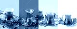 Collage of traditional Turkish tea on color background