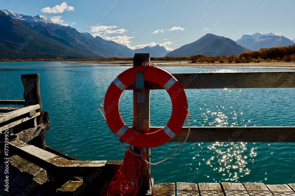 A bright orange life preserver hangs on a wooden jetty railing in Glenorchy, New Zealand on May 18, 2025. The turquoise lake and majestic, snow-capped mountains form a stunning, sunlit backdrop.
