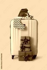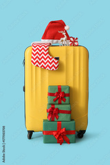 Suitcase with Santa hat, Christmas sock and presents on blue background