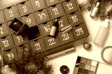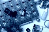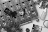 Advent calendar, different cosmetic products and Christmas decor on white grunge background