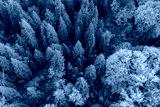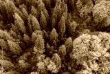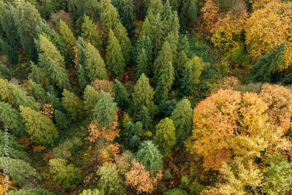 Aerial View Of Dense Autumn Forest With Evergreen Canopy And Vivid Fall Colors