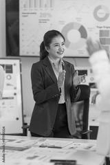Asian businesswoman clapping hands, smiling with colleagues at an office meeting, celebrating business success