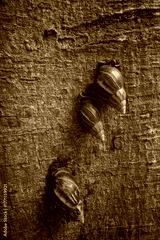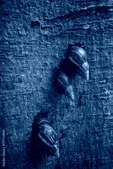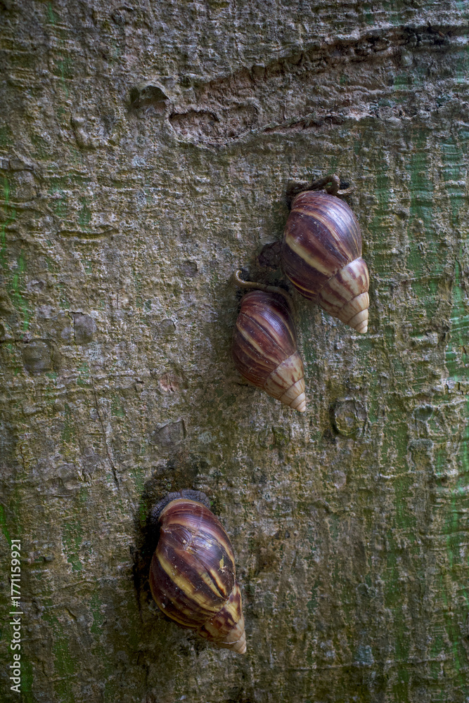 Three Bekicot, Lissachatina fulica or Achatina fulica, giant snails crawling on a tree trunk