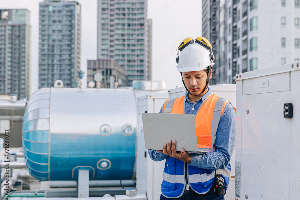 Professional engineer male technician worker service hotel boiler tank hot water supply pipe system.