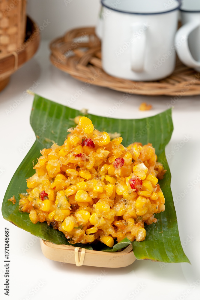 A small serving of Indonesian corn fritters, Bakwan Jagung, sits on a banana leaf and small tray. Three white enamel mugs are blurred in the background on a bright white surface.