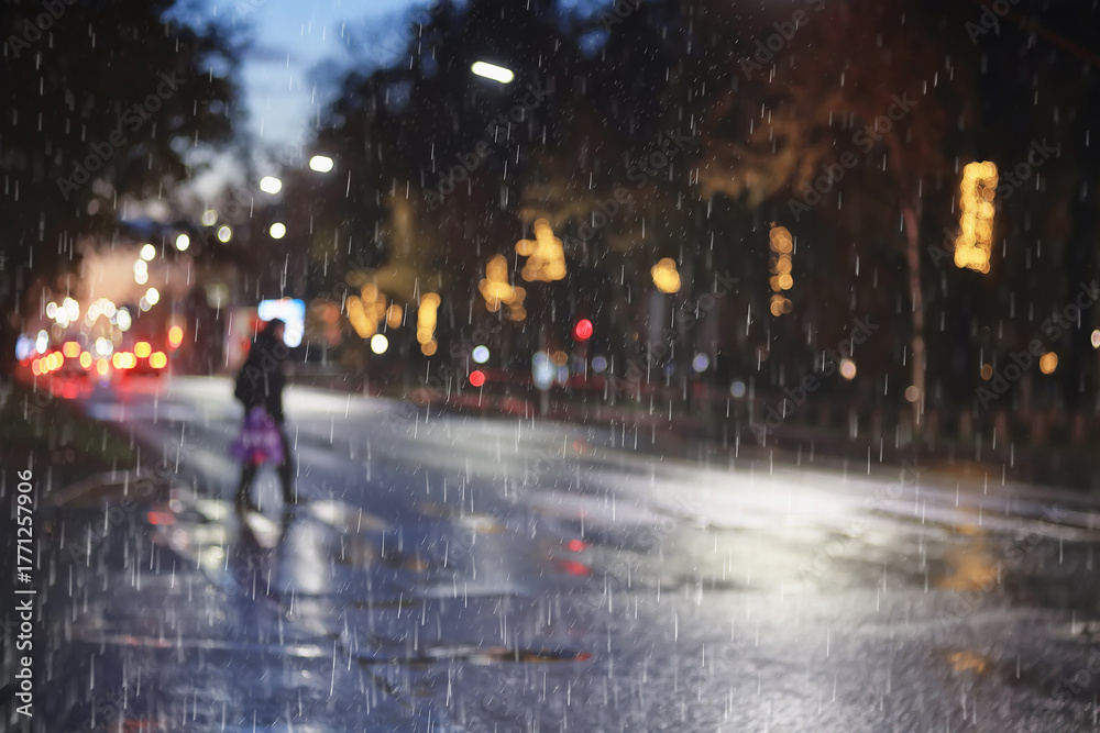 Rainy weather background on a city street, road with cars and drops of autumn rain in blur