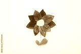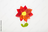 Created beautiful flower shape from red and green leaves and paper on light gray table background. Making autumn decoration. Closeup. Top down view.