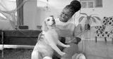 Kneeling woman wearing pastel sweater, petting white and tan dog on shag rug in living room